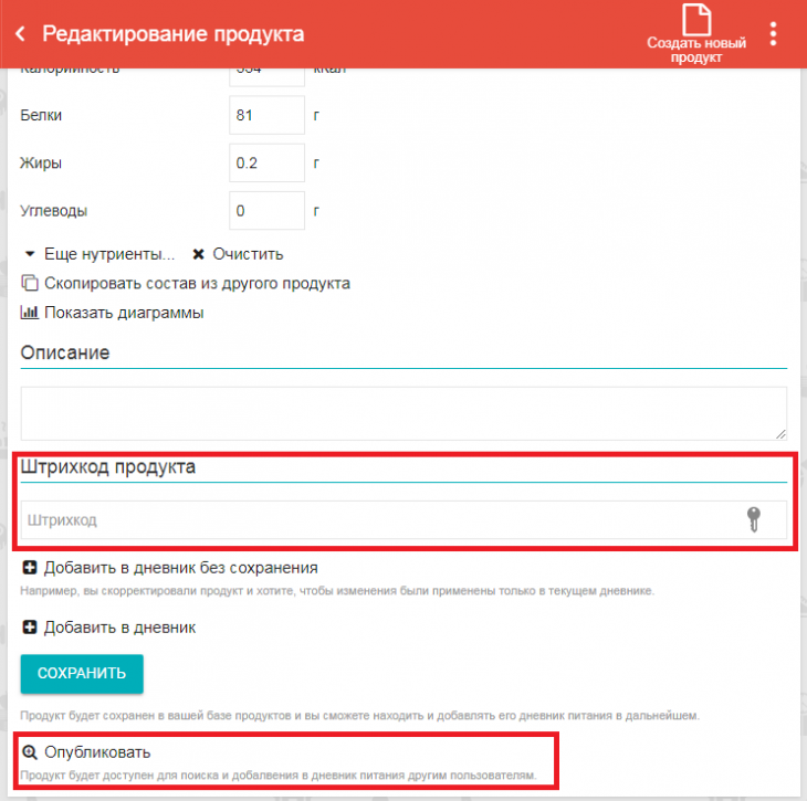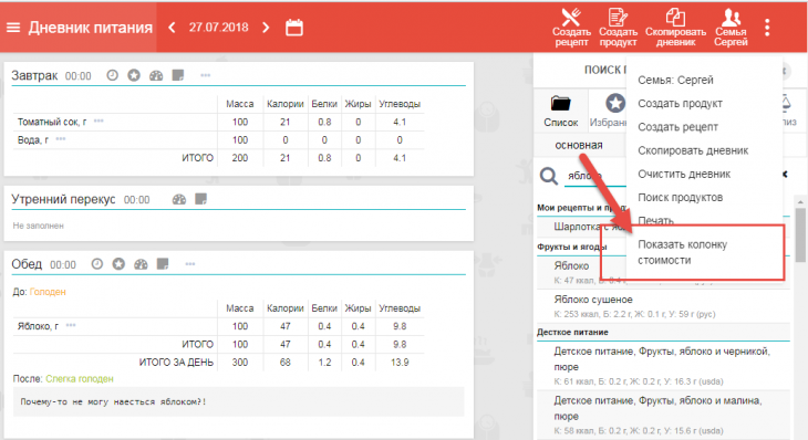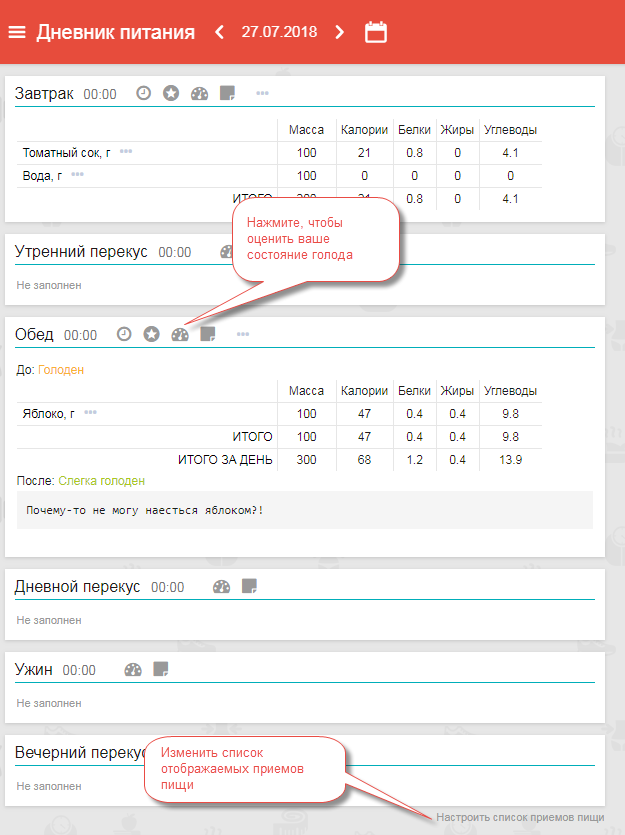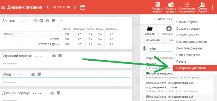 Включить их вы можете так: В дневнике питания в верхнем меню