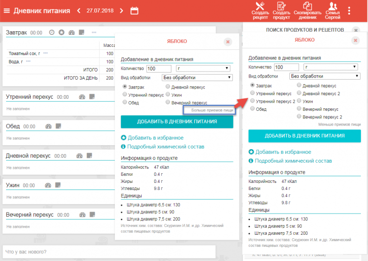 - возможность добавлять продукт сразу в несколько приемов
