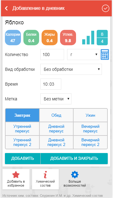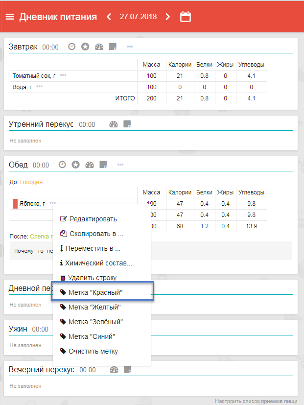- новые поля: выбор времени приема пищи и указание метки. Чтобы