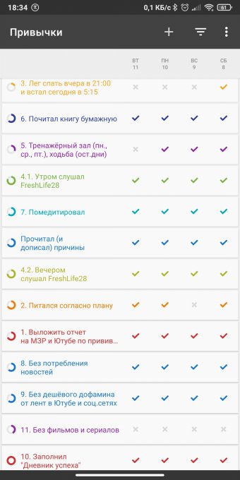 1. Сон. Спать по 8:15 (8 часов сон, 15 минут на засыпание).