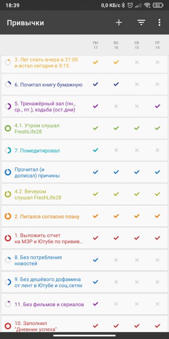 1. Сон. Спать по 8:15 (8 часов сон, 15 минут на засыпание). Ложиться спать в 21:00, вставать в 5:15. При любых раскладах важнее время подъема (если решил поспать побольше – ложись раньше, а вставать жестко в 5:15). Довести до целевого значения время подъема путем сдвигания ежедневно времени подъема на 30 минут (специалисты говорят, что человеку без стресса смещать на 1 час, я себя пожалею – 30 мин.). За 30 минут до сна, т.е. с 20:30 не пользоваться устройствами с экранами.