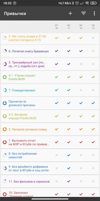 1. Сон. Спать по 8:15 (8 часов сон, 15 минут на засыпание). Ложиться спать в 21:00, вставать в 5:15. При любых раскладах важнее время подъема (если решил поспать побольше – ложись раньше, а вставать жестко в 5:15). Довести до целевого значения время подъема путем сдвигания ежедневно времени подъема на 30 минут (специалисты говорят, что человеку без стресса смещать на 1 час, я себя пожалею – 30 мин.). За 30 минут до сна, т.е. с 20:30 не пользоваться устройствами с экранами.