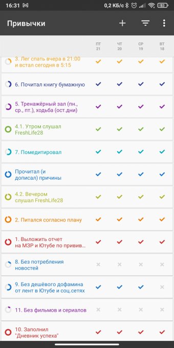 1. Сон. Спать по 8:15 (8 часов сон, 15 минут на засыпание). Ложиться спать в 21:00, вставать в 5:15. При любых раскладах важнее время подъема (если решил поспать побольше – ложись раньше, а вставать жестко в 5:15). Довести до целевого значения время подъема путем сдвигания ежедневно времени подъема на 30 минут (специалисты говорят, что человеку без стресса смещать на 1 час, я себя пожалею – 30 мин.). За 30 минут до сна, т.е. с 20:30 не пользоваться устройствами с экранами.
