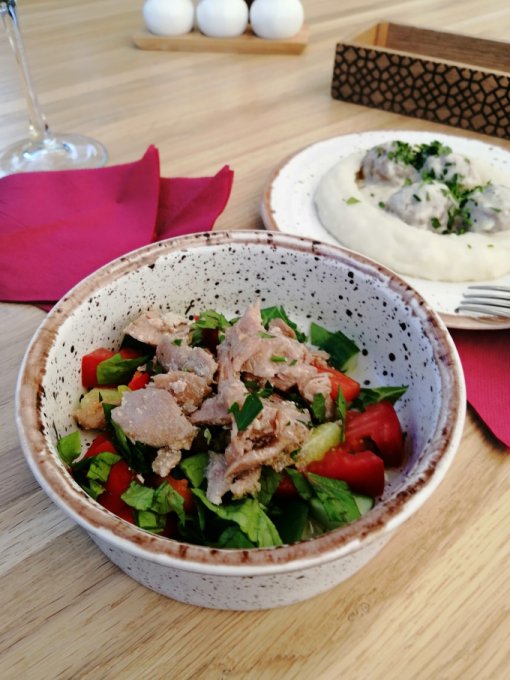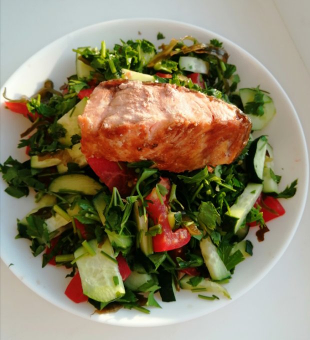 Сегодня обедали в очень уютном заведении на летней веранде. Да ещё и попали на бизнес ланч всего за 300 руб. 2 блюда. На улице было жарко, поэтому от супа отказались. Как же я соскучилась по кафешкам, уютной атмосфере, приятной музыке. Ещё был бокал белого вина. Калории записала приблизительно и не особо переживаю из-за них. Приятная беседа, вежливое обслуживание, вкусная еда, все это поднимает настроение.