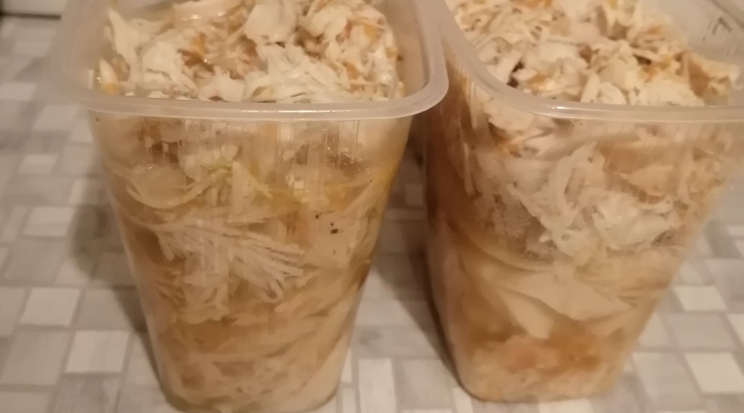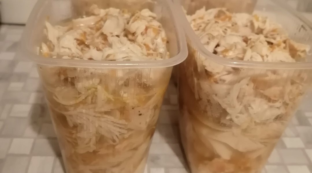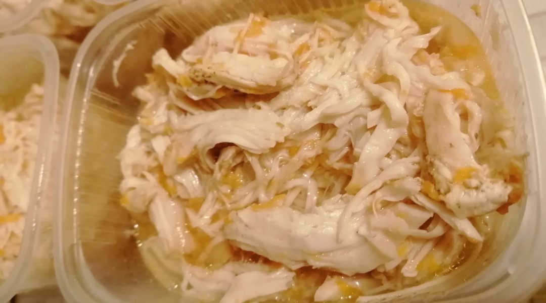 Через час спускаем давление и выкладываем курицу в подготовленные контейнеры. Грудка получается мягкая, с ароматом чеснока, легко распадается на волокна. Добавляю её к любому гарниру.