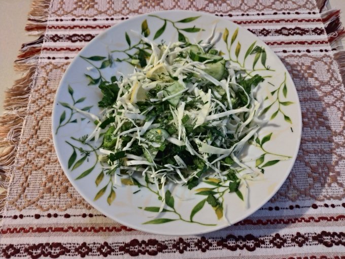 Салат: капуста, огурец, петрушка, укроп, лимон