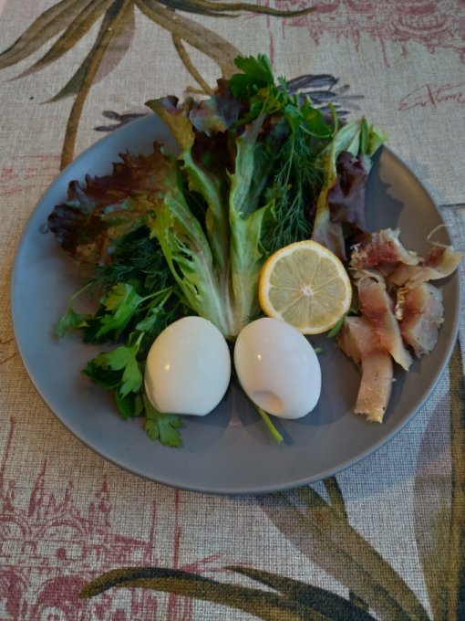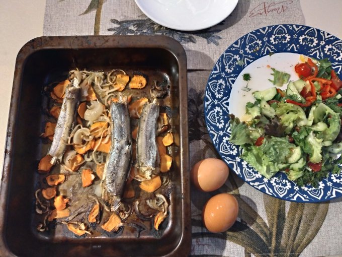 Добавил свой любимый салат с утра, но всё равно не добрал клетчатки...  Теперь в планах на завтра фалафель, тахини и окрошка. Зато с рыбой, орехами, молочкой -- всё хорошо. Есть стал почаще: не три, а пять раз в день -- просто постоянный голод, но организм справляется. Углеводы убавил и буду ещё убавлять, следить за ними, и закрою дефицитные для меня витамины: B9, E, H -- семечки, нут, маш, арахис, миндаль...