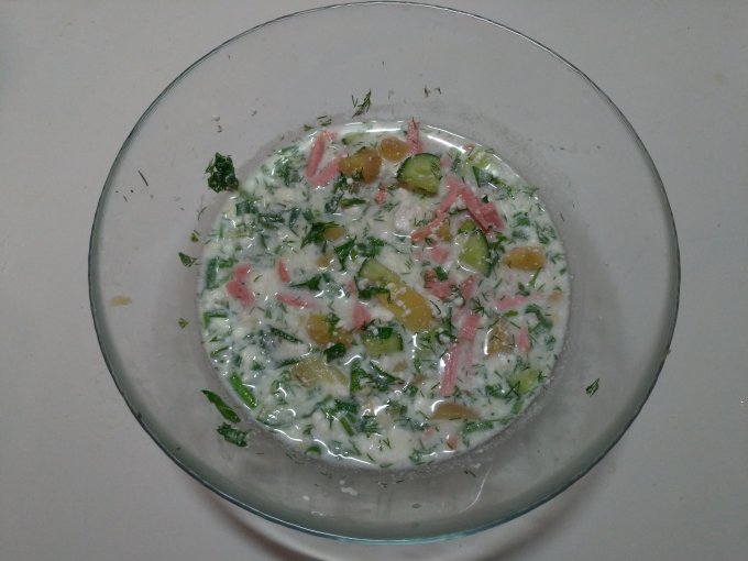 "А не добавить ли к творогу ещё и огурца?" Нормально. Ну, тогда уже и кваса можно добавить! Нормально. А вот она и картошечка "в мундирах" со вчера осталась! Ну, "раз пошла такая пьянка", из морозилки достаётся колбаса, на подоконнике -- зелёный лук. Так, аскетичный творожок с зеленью на завтрак превращается в обильную окрошку! Только без яиц, ибо их не было в готовом виде. Яйца будут сварены позже -- на ужин, -- и нут, ибо он уже давно замочен и у него уже заканчивалось терпение, -- в итоге получился божественный, и я не устоял перед тем, чтобы не закинуть в себя ещё и нута перед сном! Так, продукты диктуют и определяют мою жизнь.
