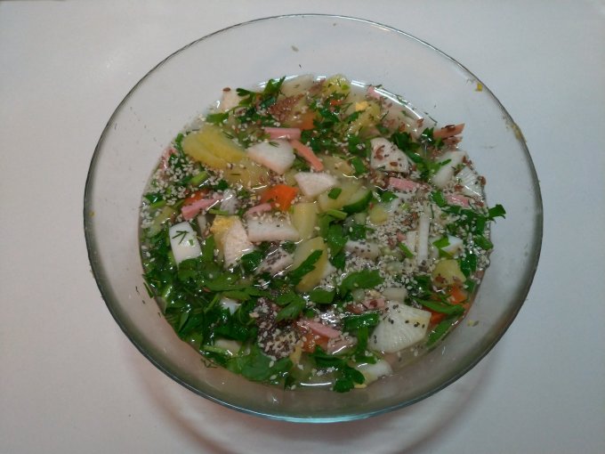 Окрошка. Добавил туда семена. Майонез я тоже реабилитировал. И хлеб. В адекватных количествах. Хоть здесь и нет хлеба. Выпечкой займусь позже.