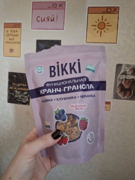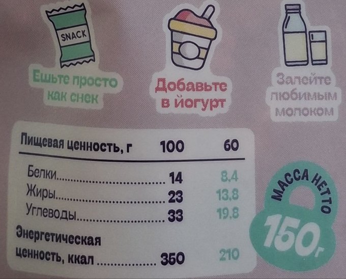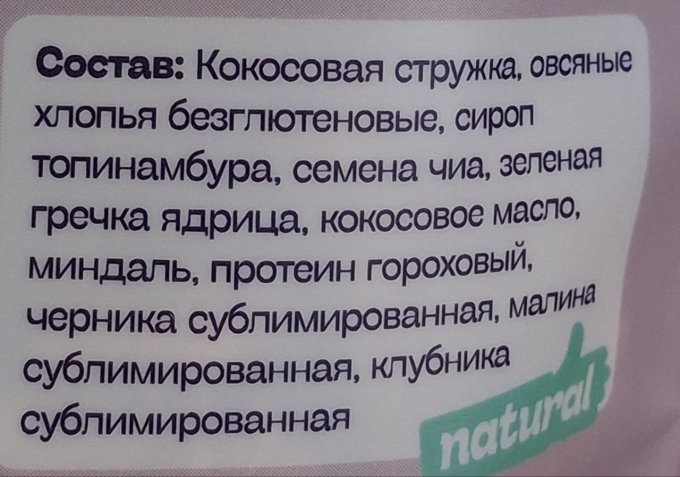 Гранола кстати обещает, что стану красоткой с сияющей кожей. При этом не содержит лактозу, пальмовое масло, сою и обещает, что не содержит глютена.