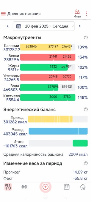 Поздравляю, результат впечатляет, больше, чем в раза превышает, прогноз. Интересно, что небольшой перебор был белков и углеводов, и такой результат замечательный. У меня перебор обычно по жирам🫣