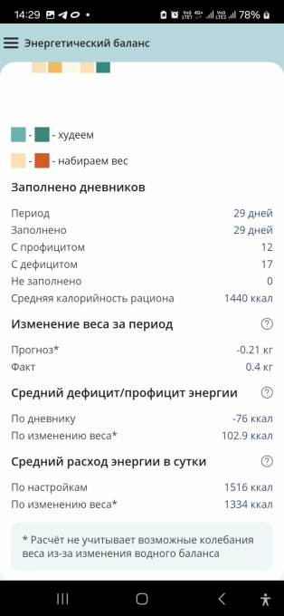 Среднюю калорийность для себя можно увидеть, выставив в дневнике отчёты за период: месяц, 3 месяца, полгода, год. Очень показательно.