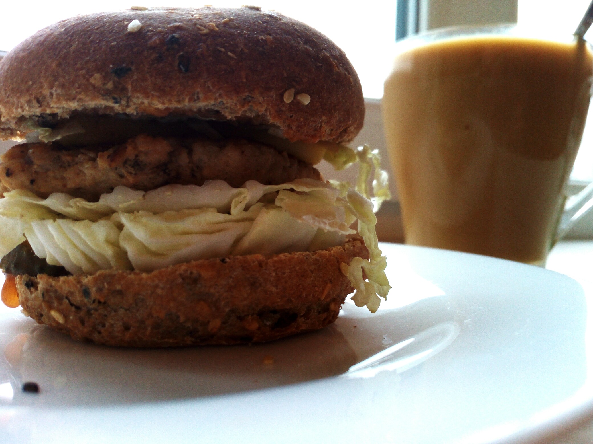 котлета тоже с ржаными отрубями, пекинская капуста, немножко сыра и