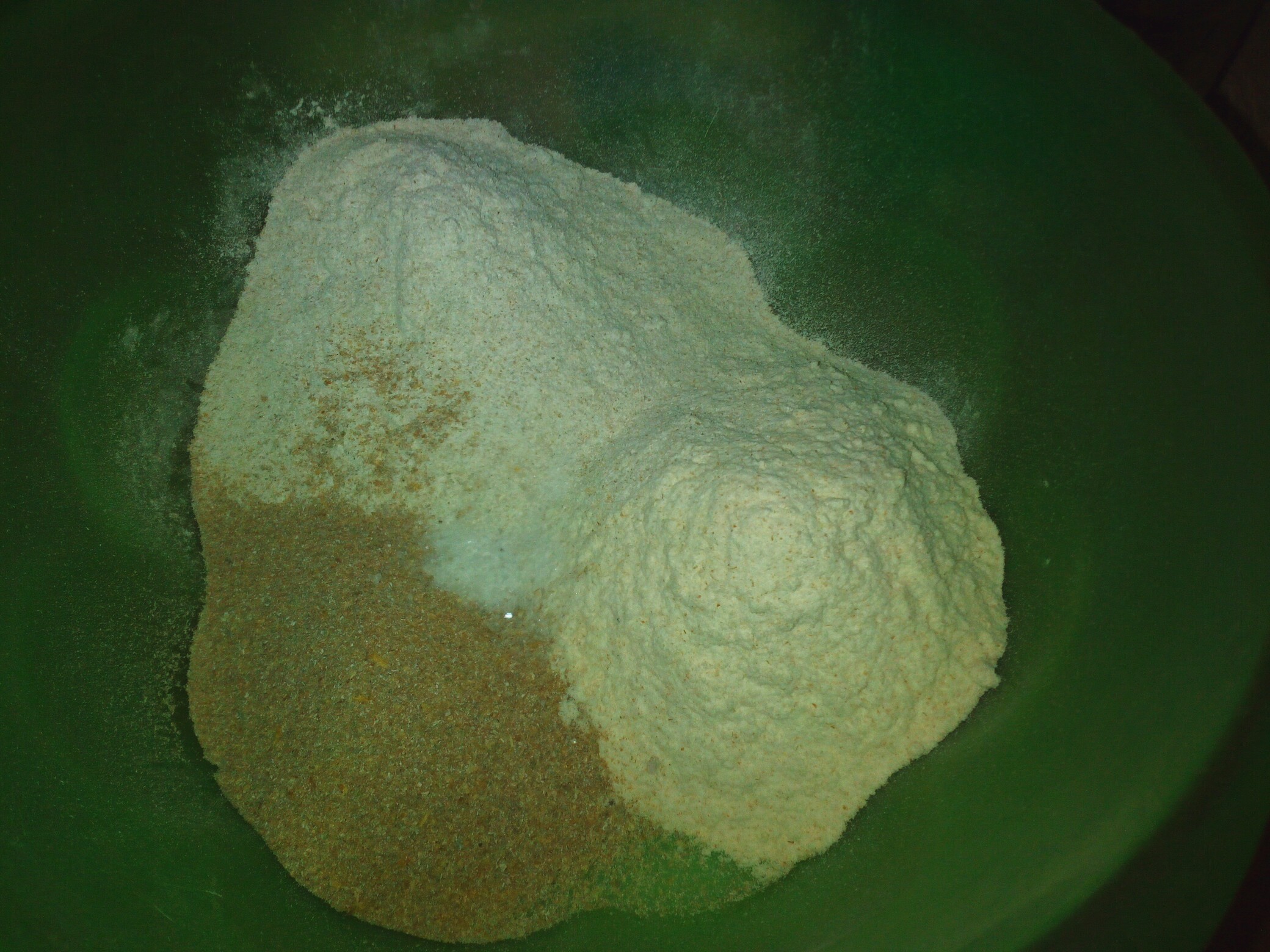1) По 160 грамм пшеничной и ржаной муки, отруби, соль, семена льна