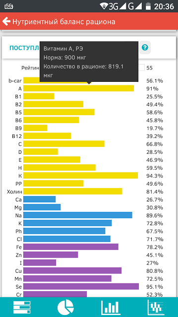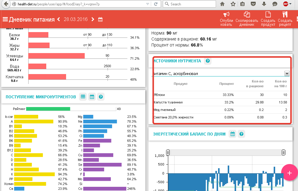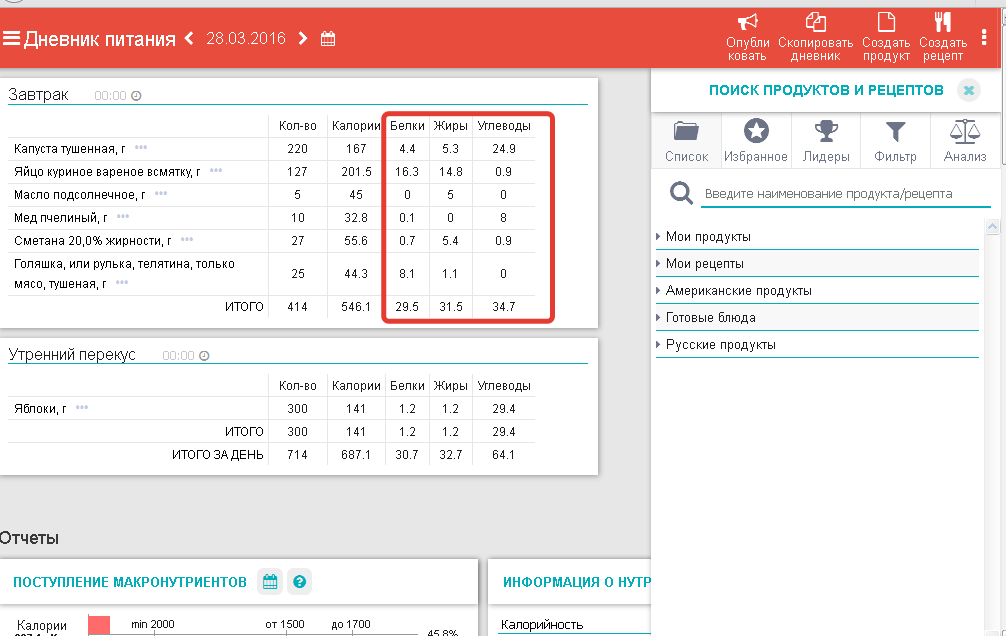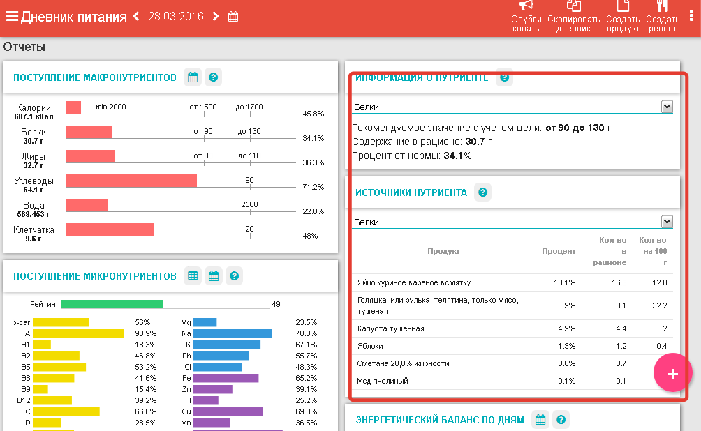 посмотреть источники тех или иных нутриентов и КБЖУ в рационе. В
