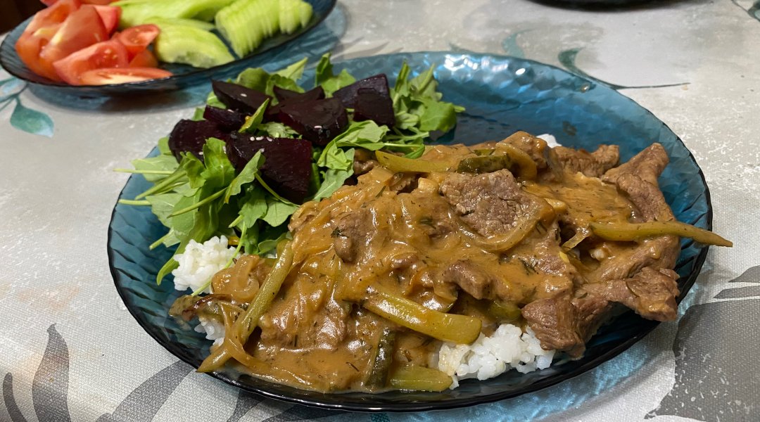 Добавить сметану и кетчуп (томатную пасту). Влить бульон или воду. Тушить 10 минут на среднем огне под крышкой.