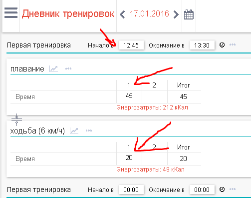 Друзья! Не могу понять куда писать время тренировок. Вот было у меня плаванье 45 минут. Пишу напротив плаванья, под столбцом с цифрой "1". А столбец с цифрой "2" зачем? И зачем снова сверху время?