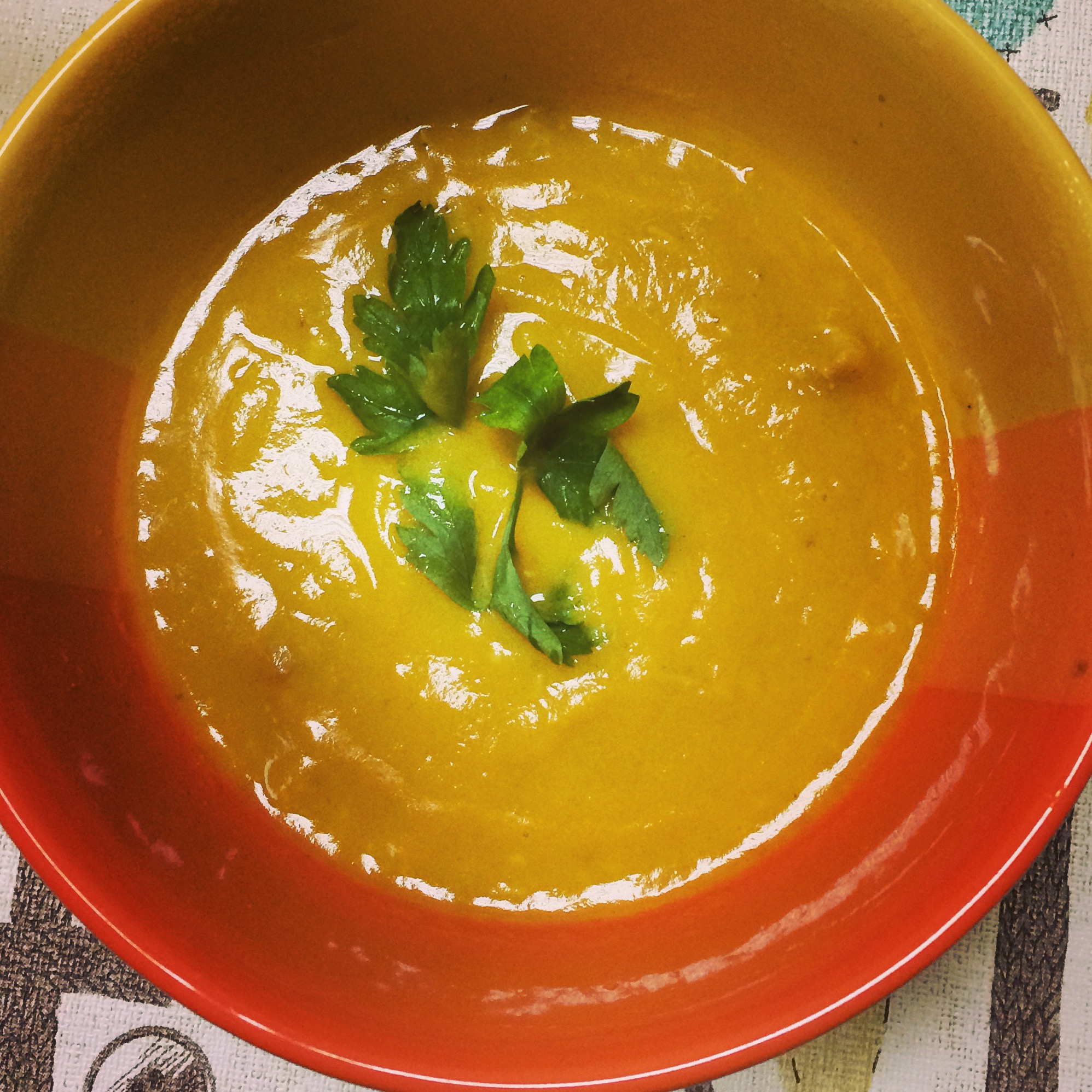 была светлая, поэтому суп получился желтый. Из яркой тыквы будет