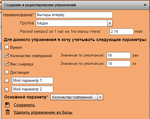 тренировок, как записать например "выпады вперёд" я с блинами