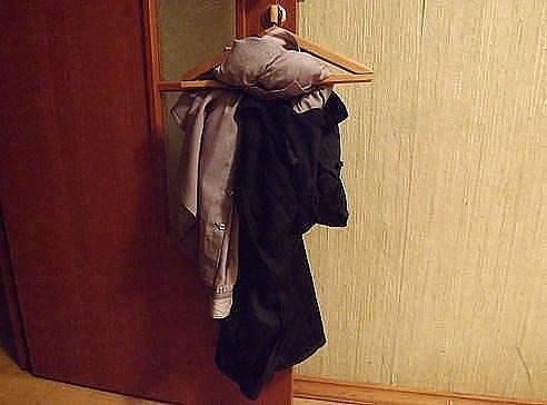 была повешена, ещё и вешалка ЛЕЖАЛА на полу, но называлось это: