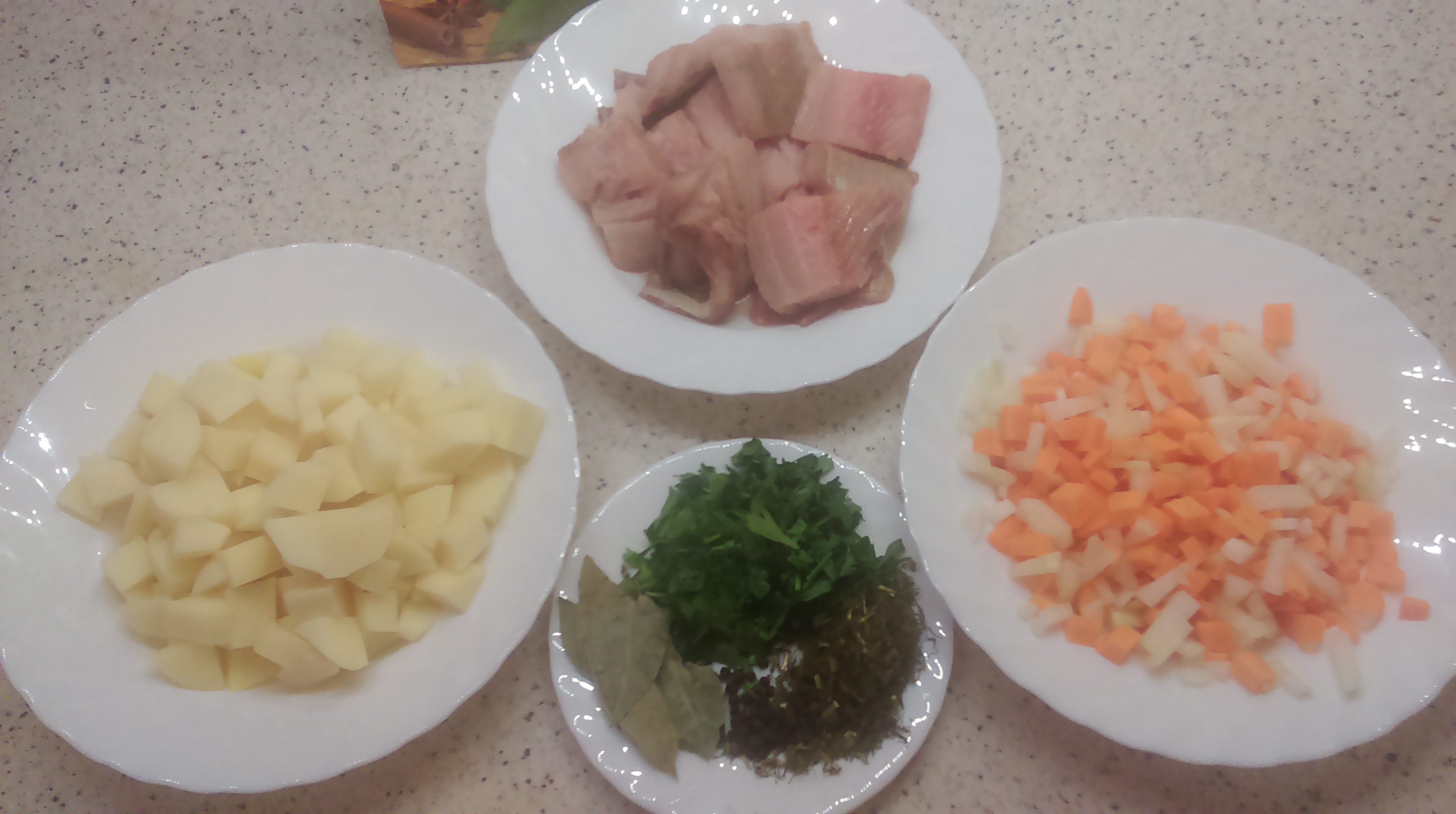 полностью от кожи и костей. Порезать крупными кусками. Картофель,
