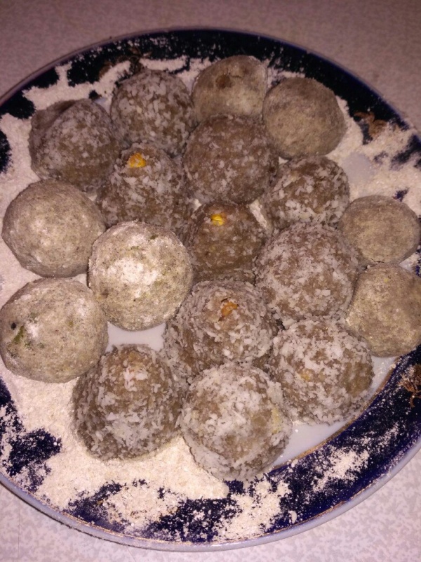 Скручиваем шарик обваливаем в кокосовой стружке.