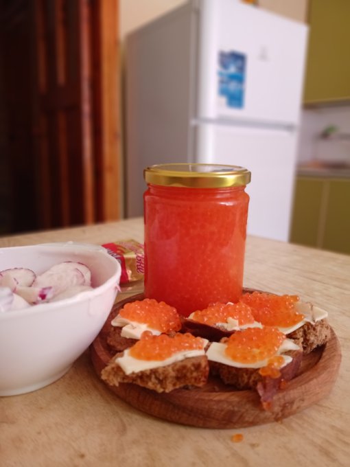 Муж привез баночку икры из искуственно вырощенных рыб ,которую доят :) Она конечно отличается от икры диких рыб, но мне понравилась . Муж вырос в Магаданской обл. и с детства рыбу не любит))) В детском саду их насильно кормили рыбьим жиром ,основной рацион состоял из рыбы и дичи. А в картофельное пюре мама ему добавляла сырой лук , видимо ,чтоб витаминизировать в условиях Севера.