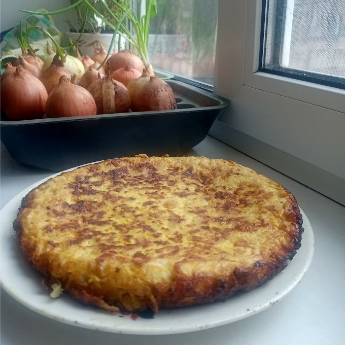 положила тарелку сверху этого "пирога" и перевернула сковородку