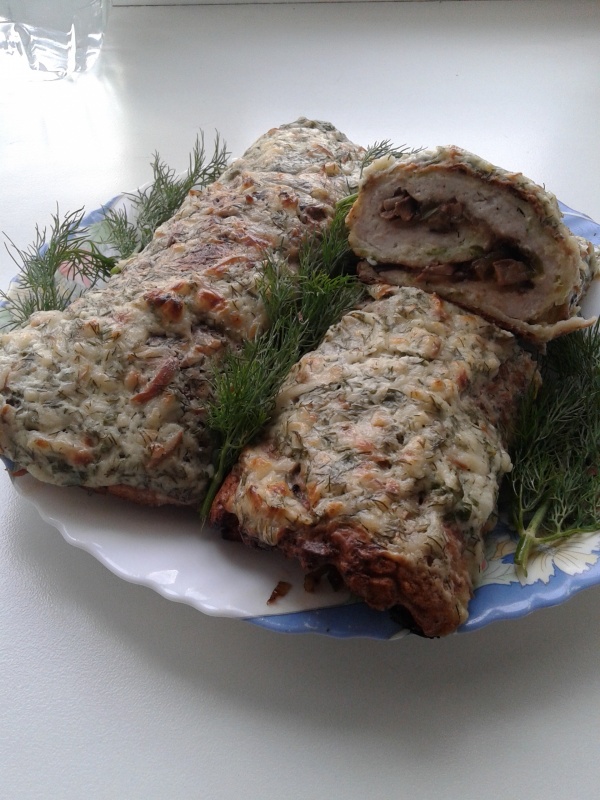 и заворачиваем рулет. Кладем в духовку. Я запекала его минут