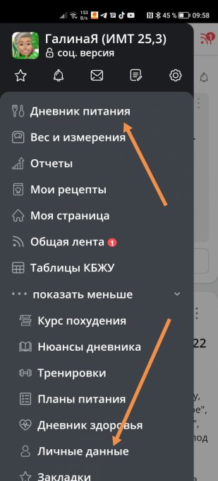Дневник питания -> личные данные-> меняем.