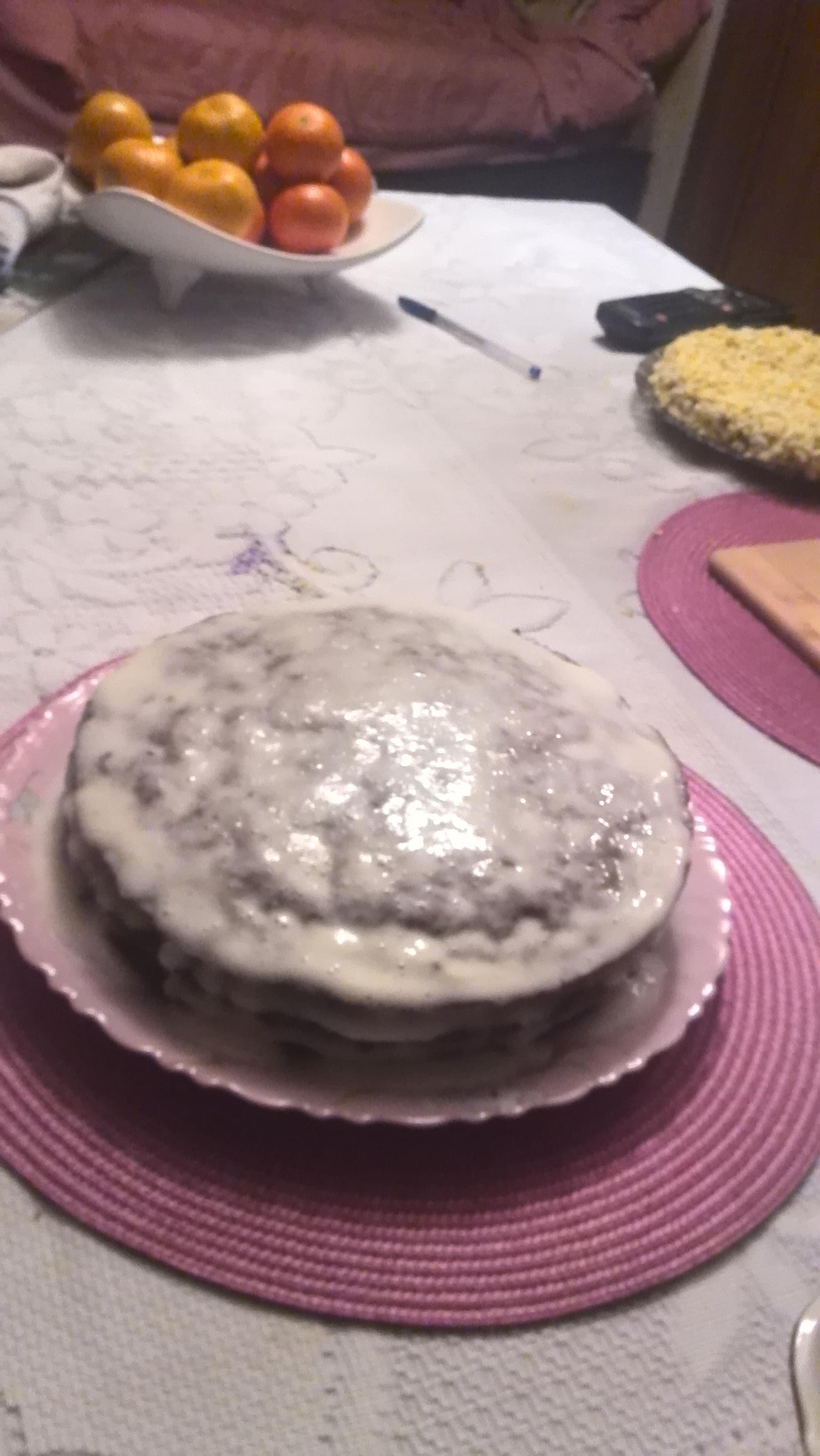 получается довольно жидкое. Из этого теста печем 2-3 коржа (я пеку