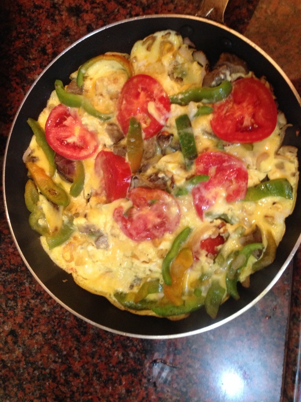омлет -много овощей и яйца взбитые с водой ,жарю на топленой масле