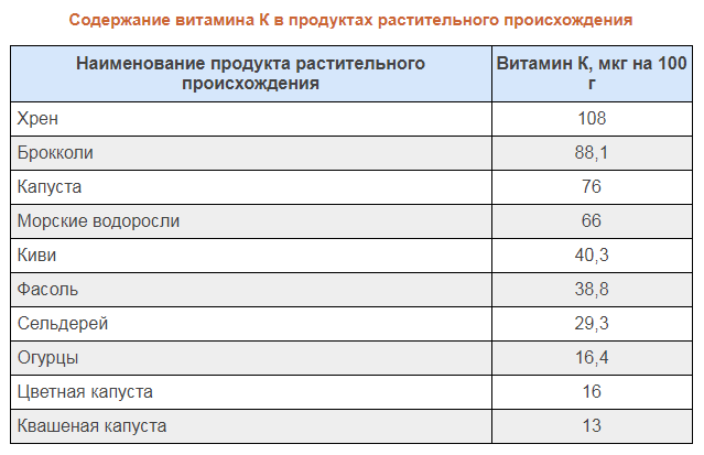 | Наименование продукта растительного происхождения | Витамин К, мкг на 100 г |