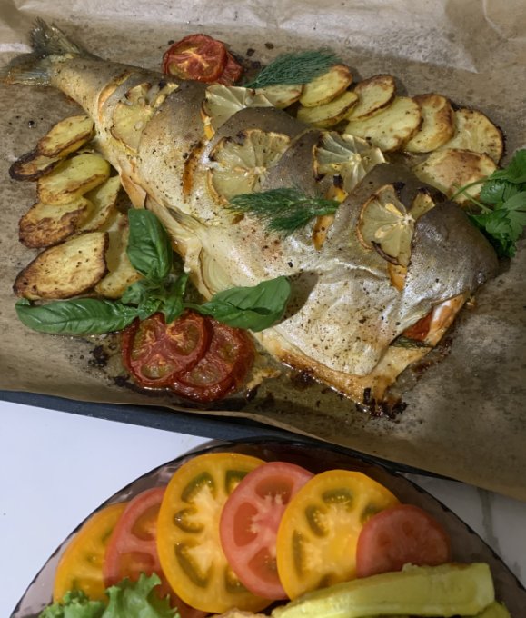 ужин - запеченная рыбка подана на том же пюре из горошка+соус+овощи сбрызнуты маслом
