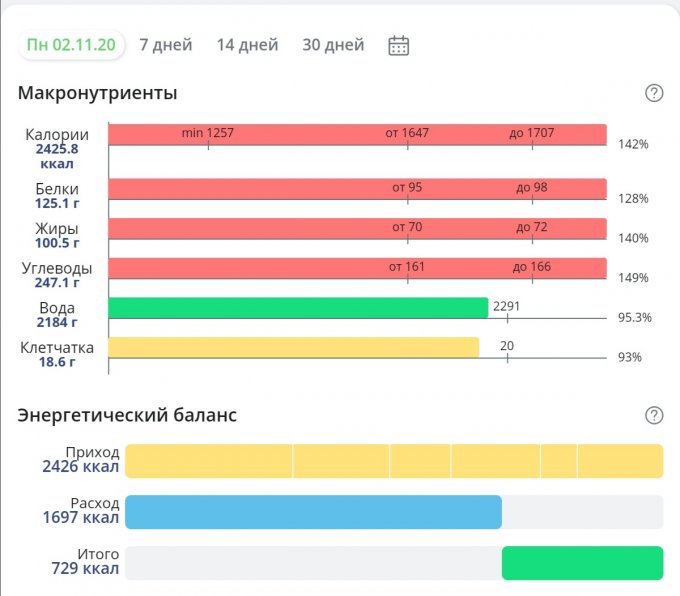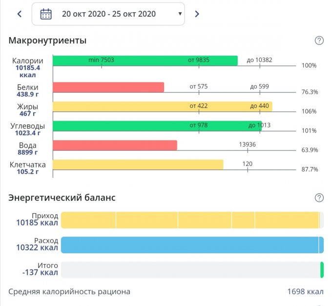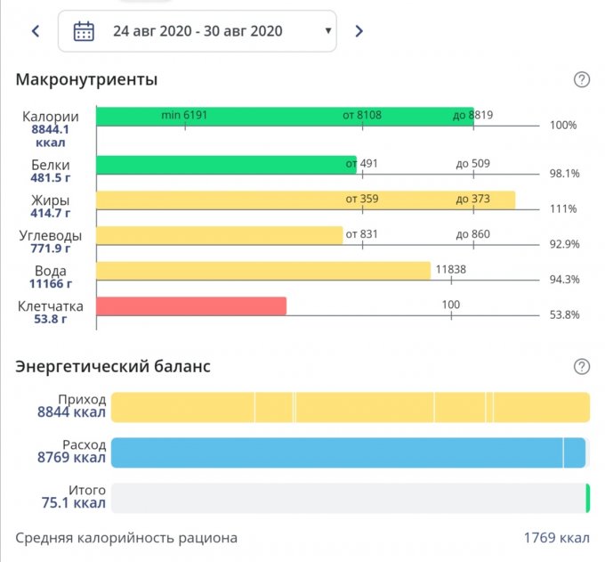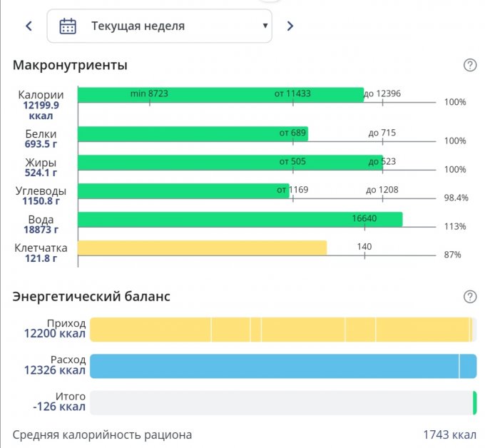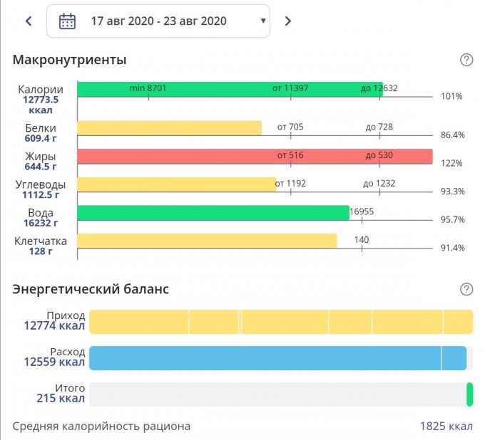 Вот последняя неделя. Решила уже притормозить и ограничить питание, в целом это удалось. Белок не смотрите, что красный - здесь наето примерно 1.2 на кг веса (норма стоит 1.5) поэтому так.