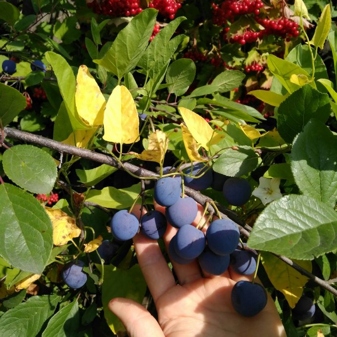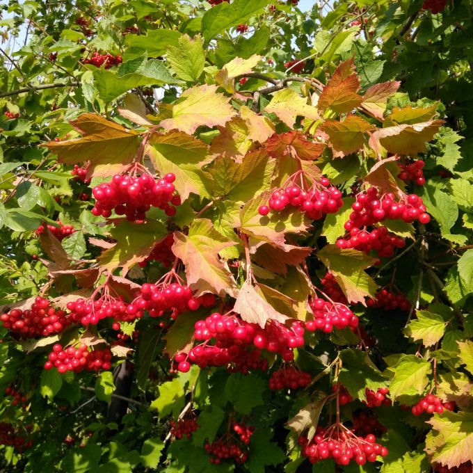 Калина - очень красивая, но не съедобная. И нет это не виноград)) такого размера у нас вырастает слива, кстати тоже не съедобная))