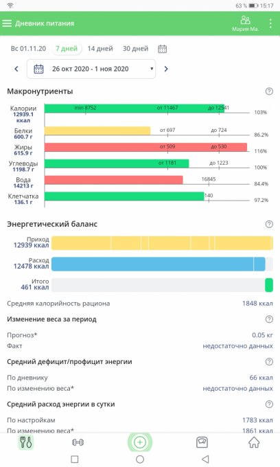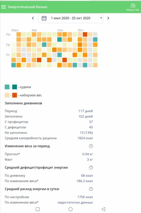 Чтобы сгладить понедельник начала реализовывать дефицит за счёт тренировок. Питалась на зелёные полоски, не внося тренировки, в конце недели внесла.