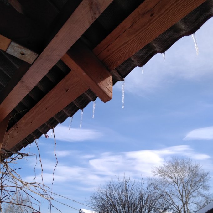 С крыши капает подтаявший снег, и, приятно булькая, делает дырочки