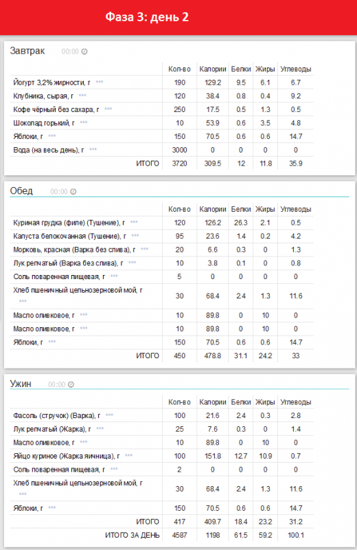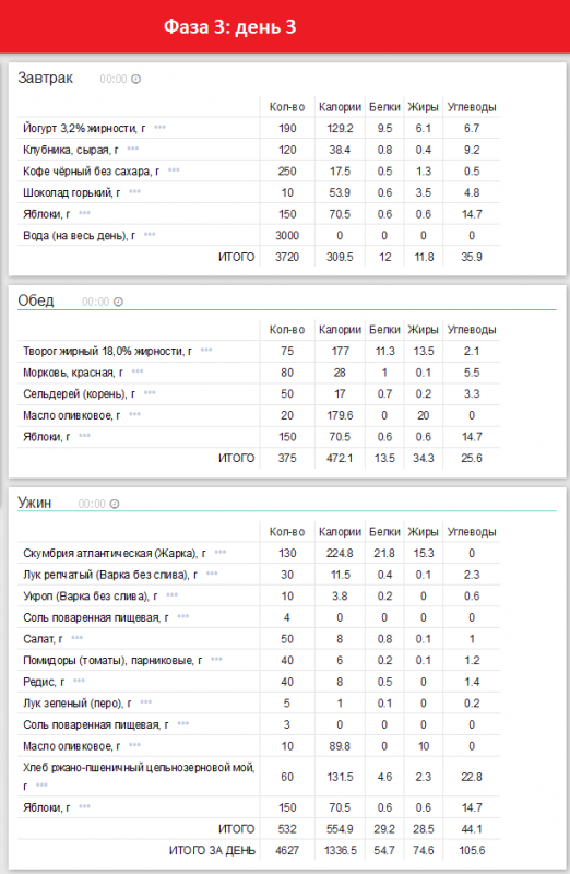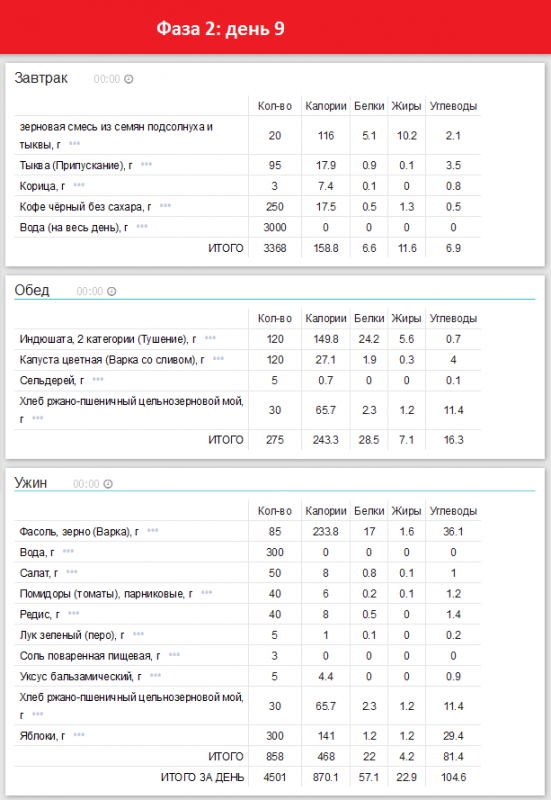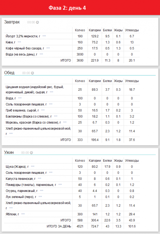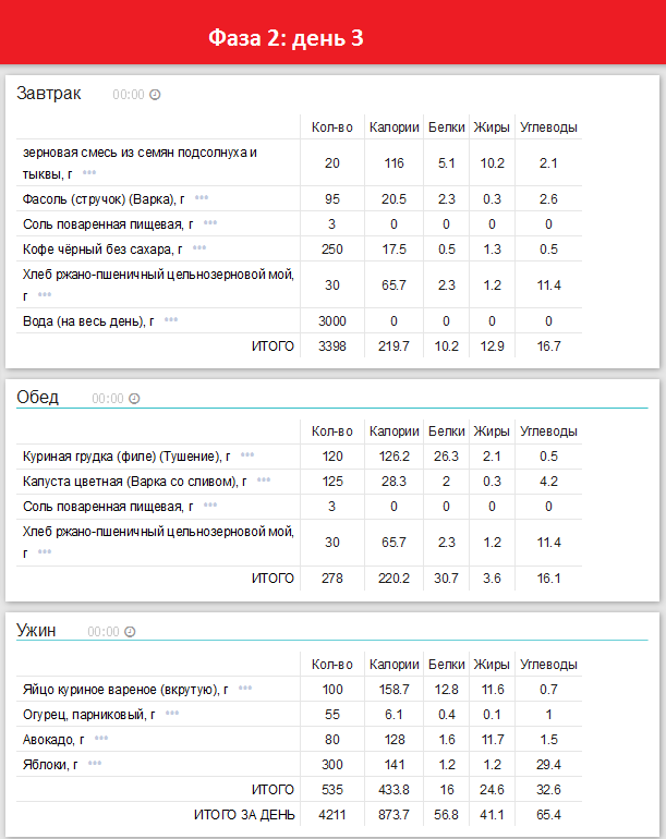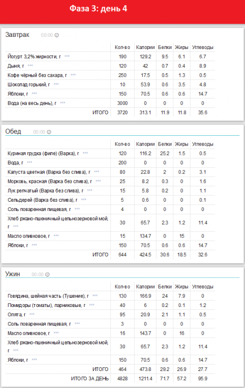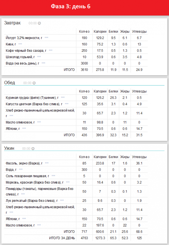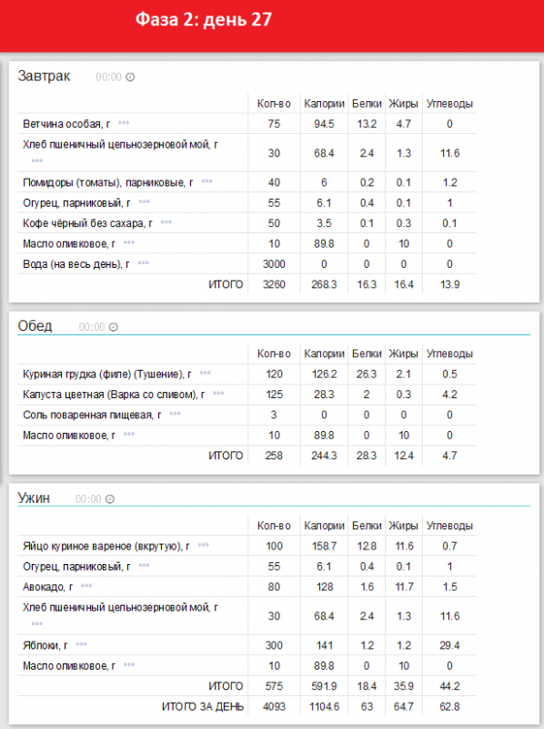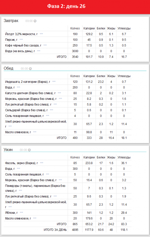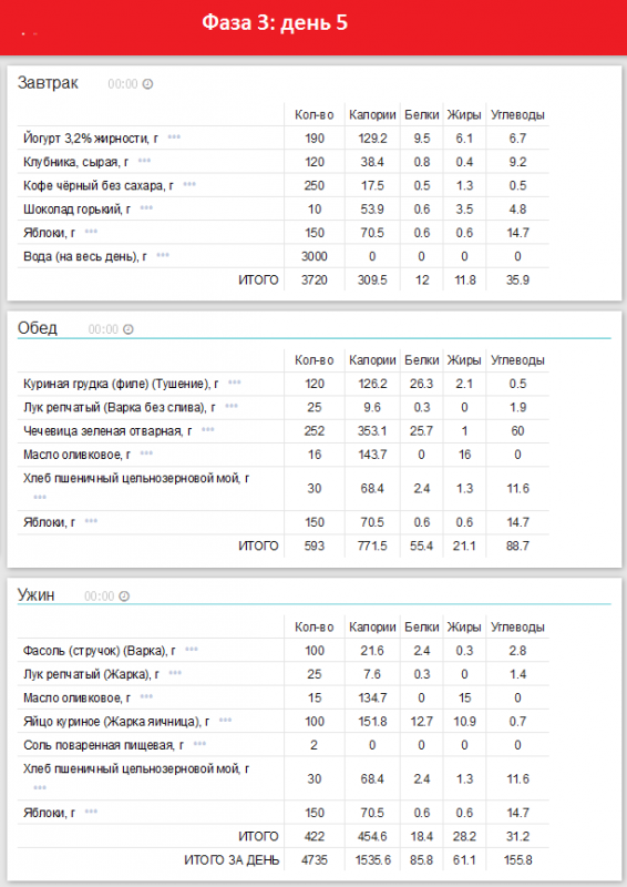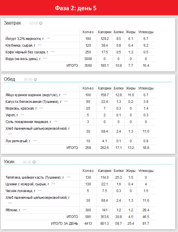 Для этой фазы в анализируемом меню для каждого приёма пищи