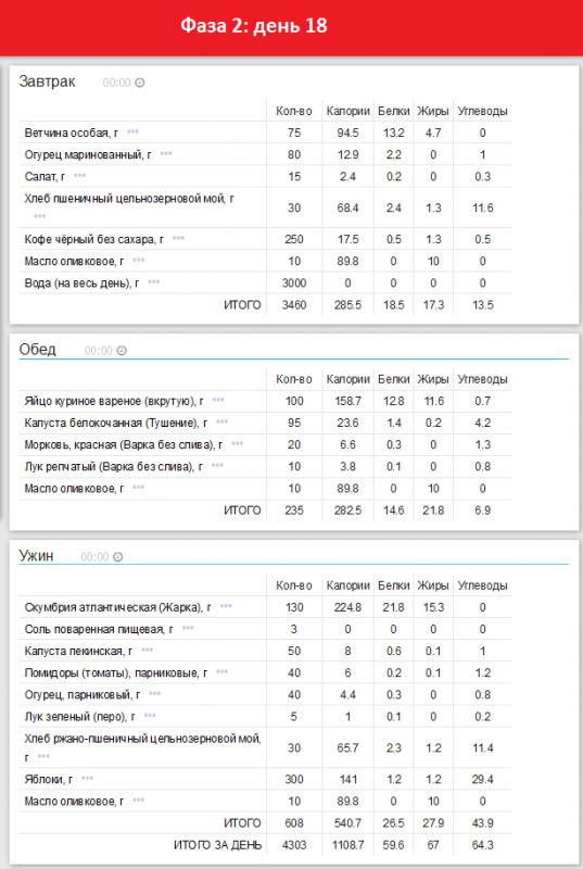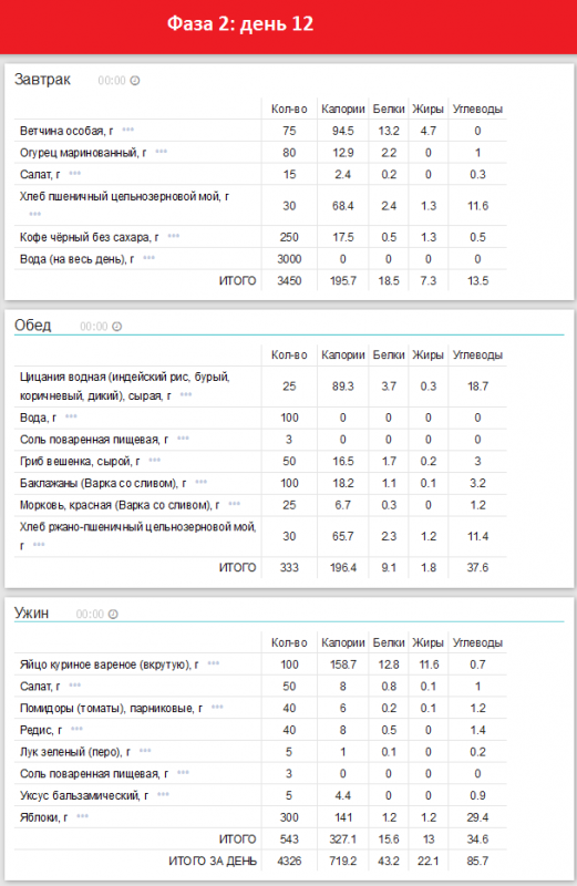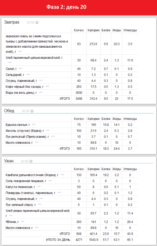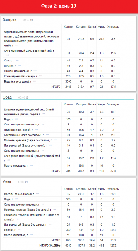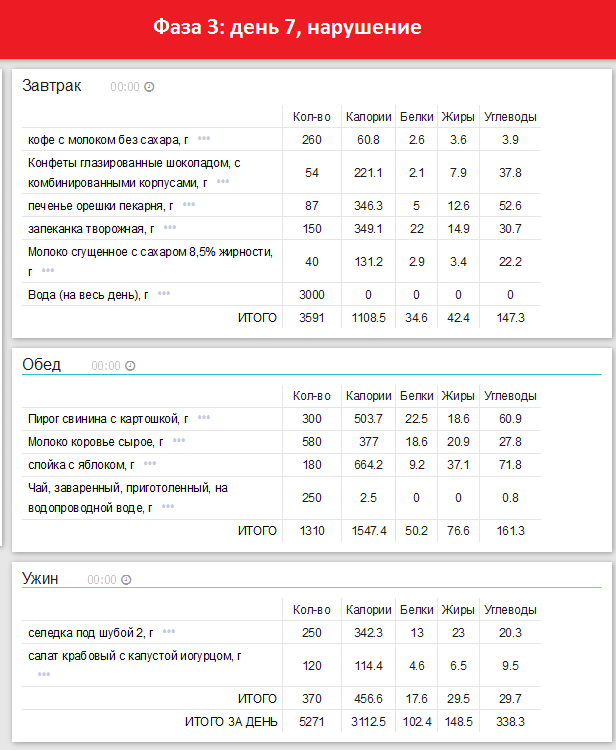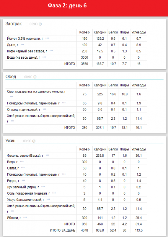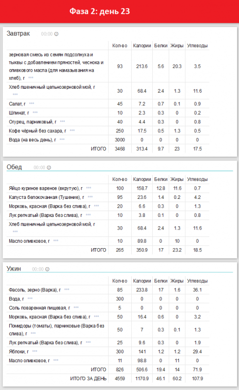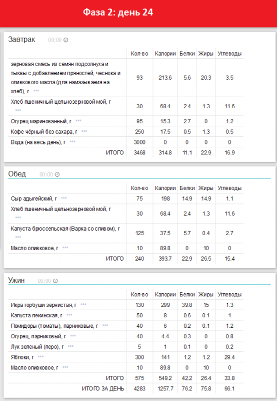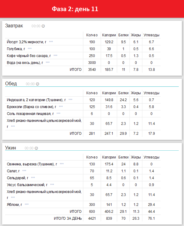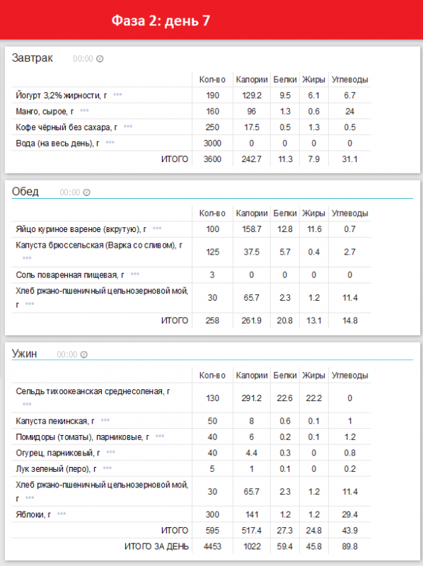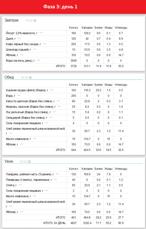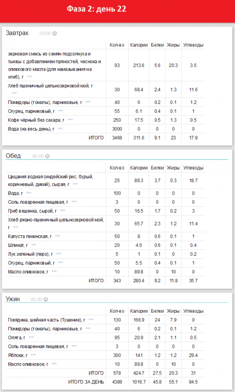 Для этой фазы в анализируемом меню для каждого приёма пищи