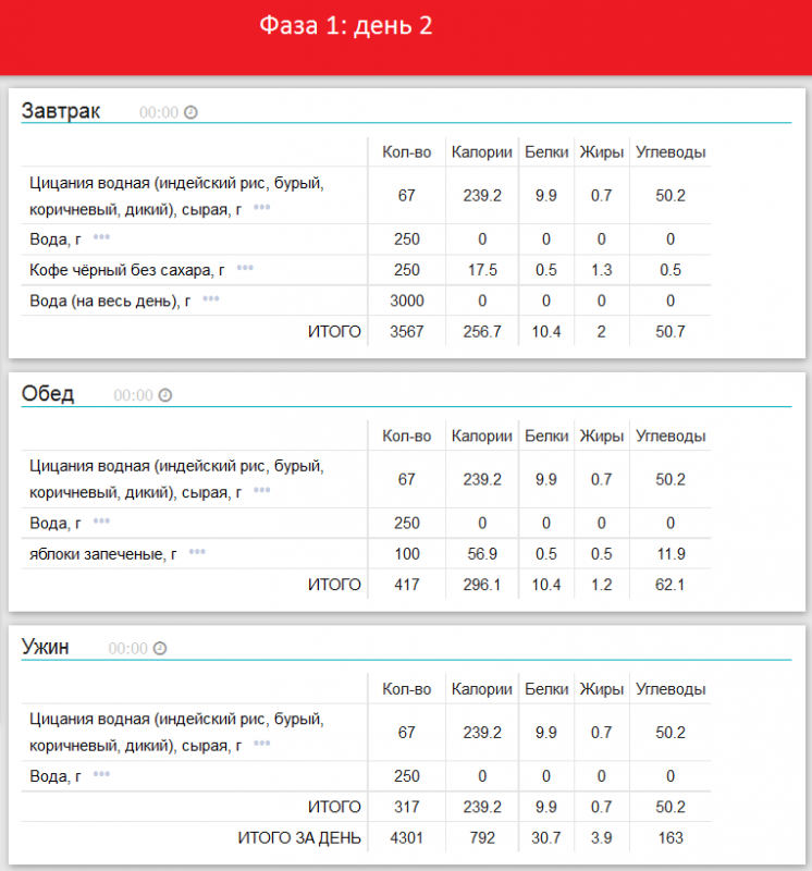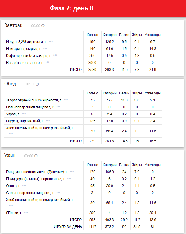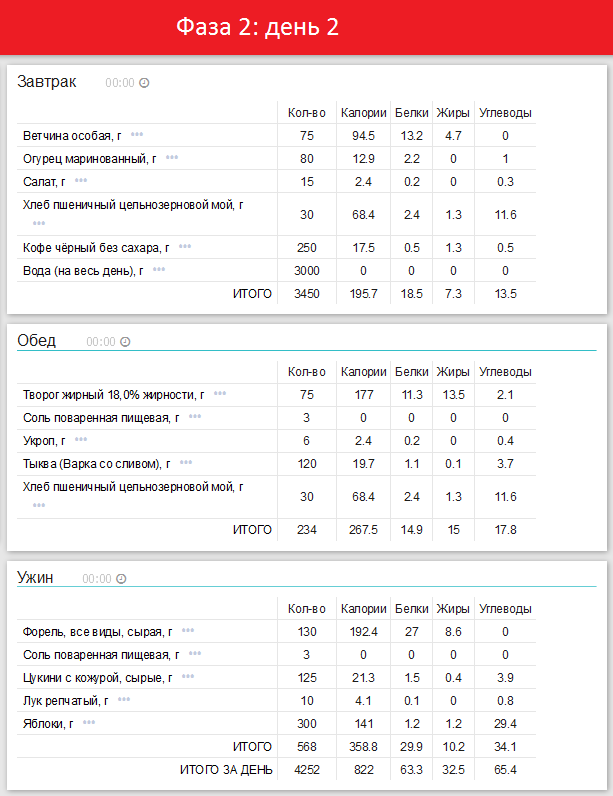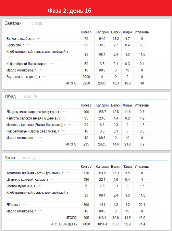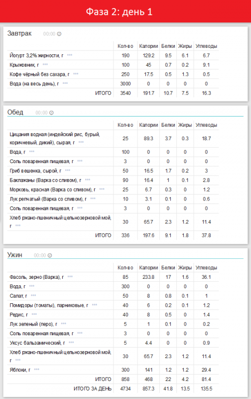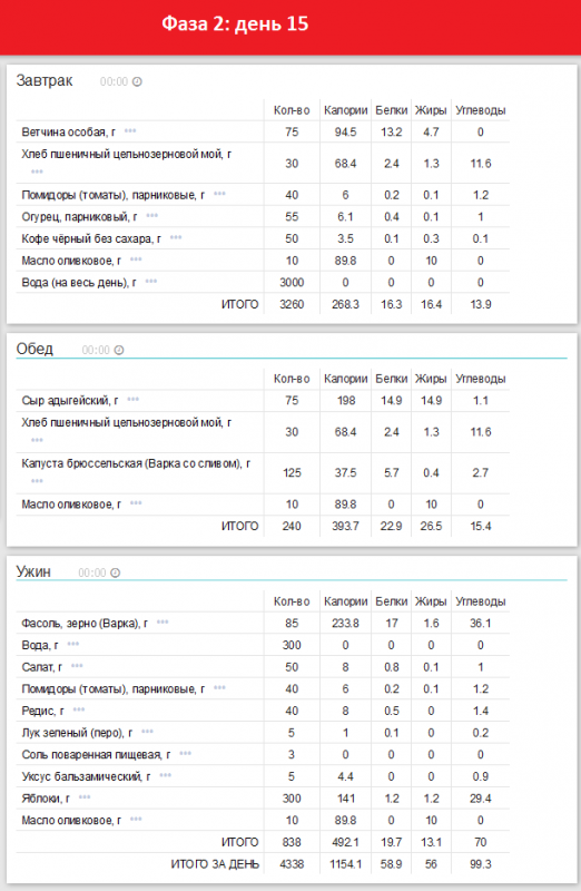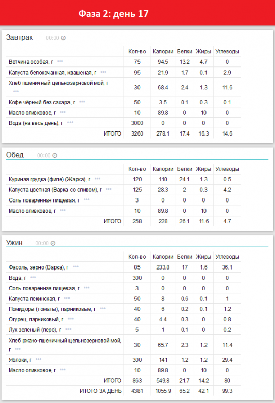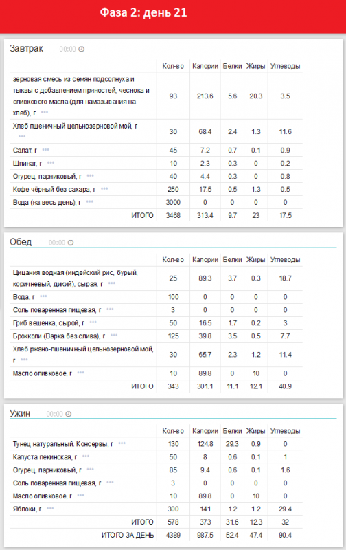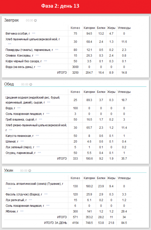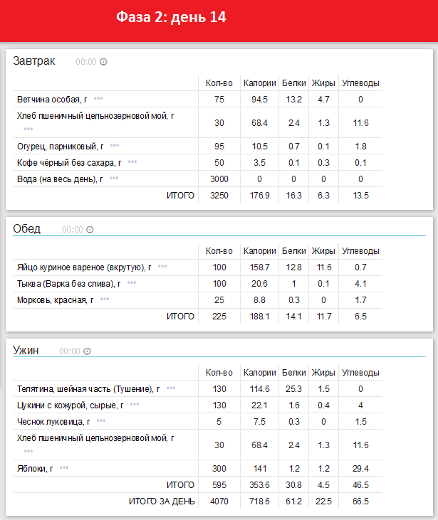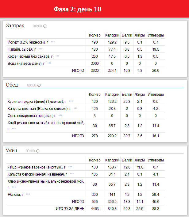 Для этой фазы в анализируемом меню для каждого приёма пищи