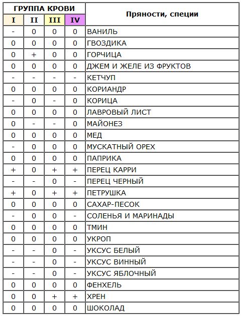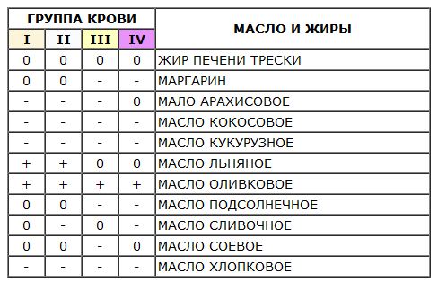 Вот пример таблицы продуктов по группам крови: