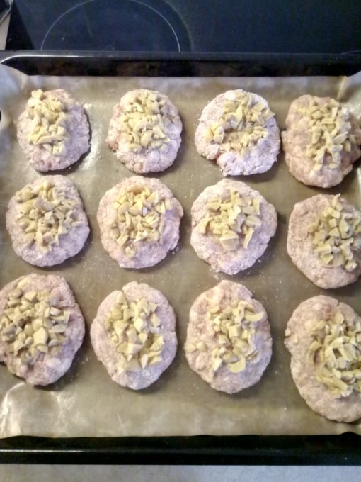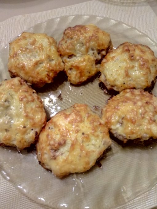 Сырой картофель трем на мелкой терке, добавляем чеснок и майонез, перемешиваем и выкладываем на грибы. Сыр натираем на терке и посыпаем котлетки.