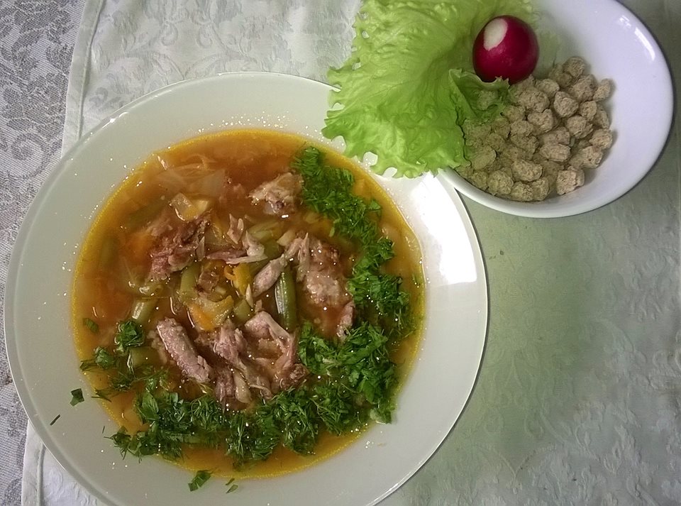 За 5 минут до готовности кладем в суп мясо. Готово!