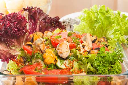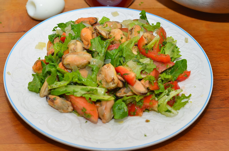 ингредиенты (мидии, помидоры, оливки, морковь,перец.), заправленные