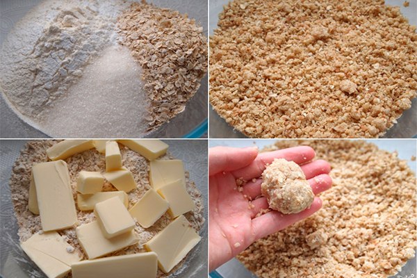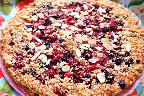 Посыпьте верх крошкой из оставленного теста. Слегка присыпьте