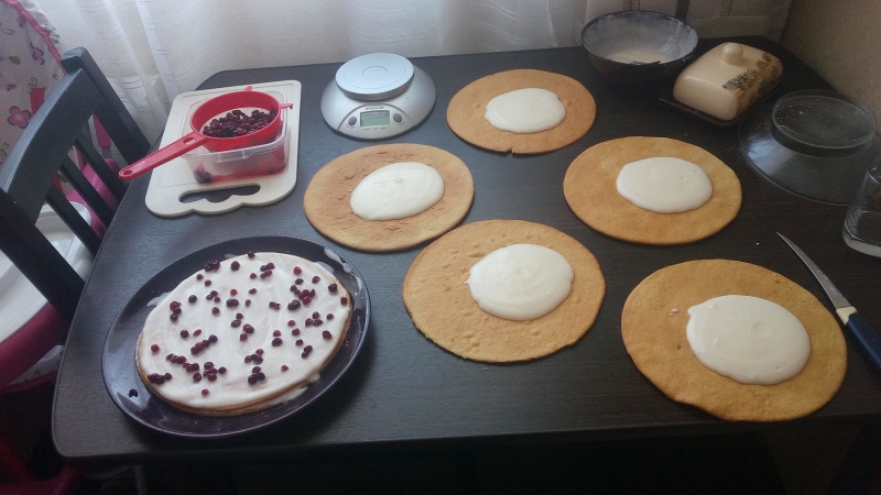 Готовые коржи разложить перед собой, равномерно распределить по ним