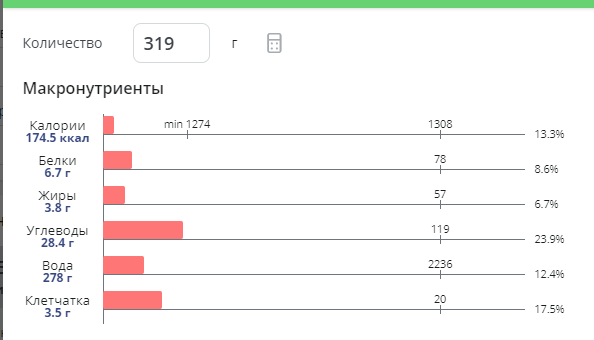 42г,вода237. Вес готового блюда 319 .и калорий в дневнике на этот