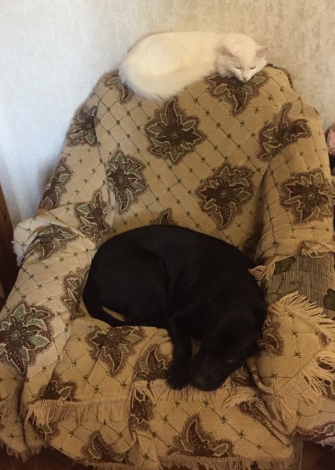Она Дюймовочка, маленькая для своей породы, последняя в помёте, но такая любимая. С кошкой не дружат, но уже дрыхнут рядом.