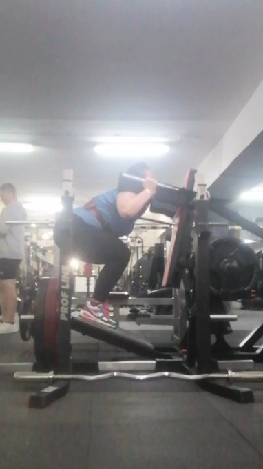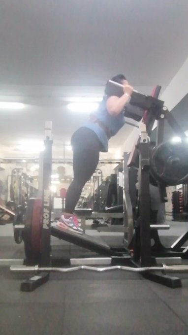 По плану были приседы в Смитте, но я там не могу никакие упражнения делать, сколько раз не пробовала... Поменяли на гакк... На фото последний подход... 100кг...Тренер технику одобрил... Значит не такая я пропащая😆😆